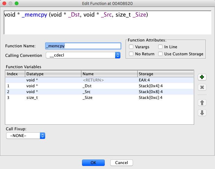 Storage for return/parameters can be computed dynamically based upon the associated calling convention and data types (i.e., complete function signature). The ability to properly compute the correct storage is limited by the current capabilities of the function prototype models and Decompiler within Ghidra. In some cases it will be necessary to enable Custom Storage for a function and specify the correct storage locations for the return/parameters including the ability to join multiple storage elements (i.e., varnodes) for a single parameter.