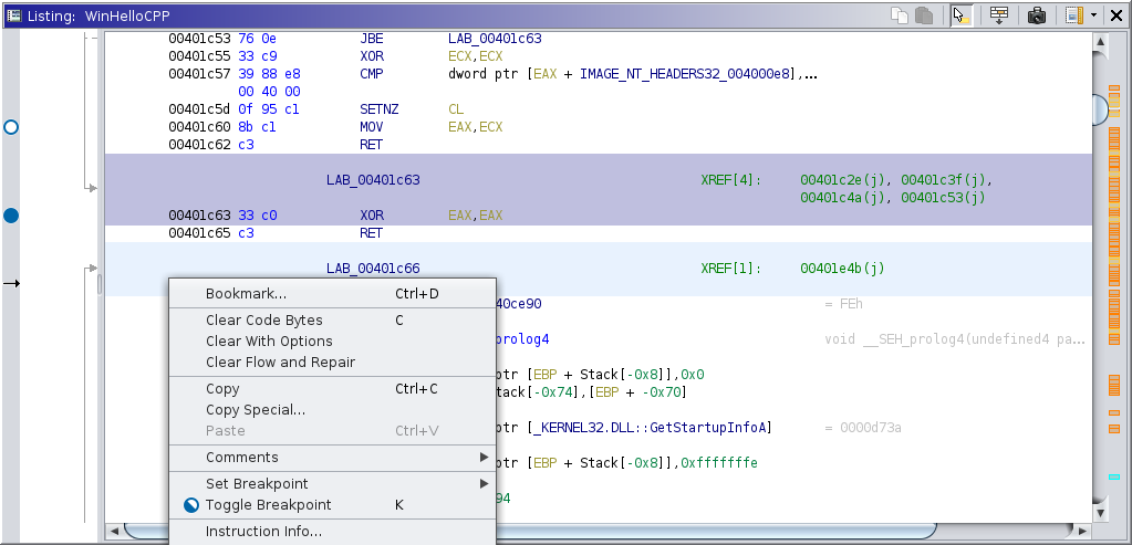 For a description of how breakpoints are managed logically in Ghidra, please read about the Breakpoints window. Each individual breakpoint location is placed in its respective listing. Breakpoints are best controlled using the static program listing, where they are stored as bookmarks. When this plugin is active, additional actions are available for managing breakpoints and their locations on target. The actions in the static listing manipulate the logical breakpoint as a whole; whereas, the actions in the dynamic listing tend to manipulate just the locations for the current target. NOTE: Depending on the connected debugger, locations resulting from a common specification may not be independently manipulated.