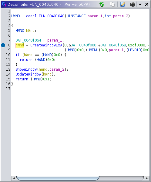 When active in the Debugger, the Decompiler will display breakpoints in its margin. Keep in mind, the relationship between machine instructions and the decompiled code is not always so simple. One line may correspond to a single address, many addresses, or no addresses at all. If there is a breakpoint at any address for a given line, then that line will have a marker indicating the breakpoint's state. If there are multiple, then that state may be mixed. In most cases, Setting a breakpoint in the decompiler will suggest a Software Execution breakpoint at the minimum address of the current line. If the current token is a static variable, then it will suggest a Read/Write breakpoint at the variable's address. (Note that Read/Write breakpoints are not indicated in the Decompiler's margin.) The other actions affect all breakpoints on the current line.