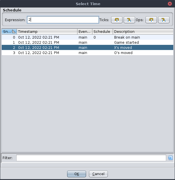 Optionally, the specified time may also include emulation. See the Go To Time action for the syntax of the Time Schedule expression. For simple schedules, the step buttons provide convenient forward and backward changes to the emulation schedule. Perhaps the most common use of this is to see what changes from executing an isolated block of code. Ideally, the baseline is a relatively complete capture or represents the present in a live session, so that the emulator does not depend on un-recorded state: