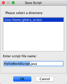 Saves the script (with any changes) to a new script file. The default directory is your home directory, however if additional script directories exist, then you will be prompted to select a directory. This new script file becomes the active script in the editor. When selecting Save As..., Ghidra will prompt for a filename.