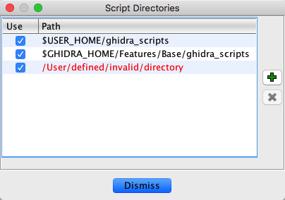 Allows you to add and remove directories to search for scripts and other dependencies for use by scripts. The default directories are your home directory and the various system directories (e.g., $GHIDRA_HOME/Features/Base/ghidra_scripts). You can save directories, but ignore them in the Script Manager dialog by selecting/deselecting the "Enable" column checkbox.