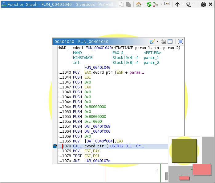 When active in the Debugger, the Function Graph will display breakpoints using background colors and markers in each vertex's margin. The margin behaves exactly as it would in the static listing. A marker is displayed at each address with a breakpoint indicating its state. Multiple breakpoints at an address may result in display of a mixed state. Double clicking in the margin will set or toggle a breakpoint at that address.