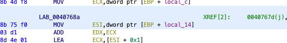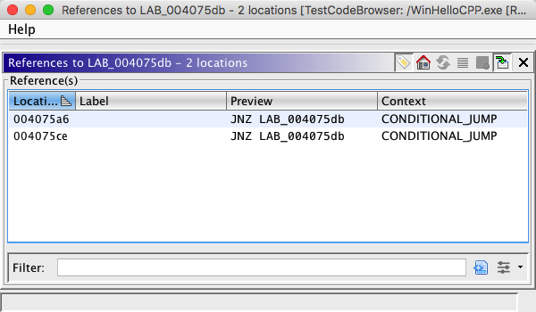 The Location References Dialog displays all the memory reference destinations to a specific code unit that is described by the item under the current location. For example, if the current location is a referenced label, then the dialog will show references to that label and not the current address. In the following snippet, the label "LAB_40768a" is the field at the current location.