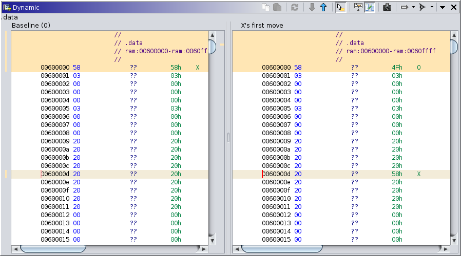 A common strategy in dynamic analysis is to compare machine state between two points in time. To this end, to support comparison of bytes in memory, the "trace diff" plugin extends the Dynamic Listing to provide side-by-side comparison of two different points in time. When active, listings for both points in time are displayed and the byte value differences between them are highlighted. NOTE: This does not compare annotations. It only compares raw byte values. Additionally, all stale values are ignored, i.e., to show as a difference, the memory must be observed at both points in time, and the values must differ.