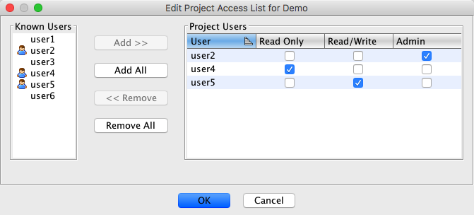 Edit Project Access List will be enabled. The dialog displayed when you select this option shows a panel that is the same as the one you see in the New Project Wizard when you set up the user list for new project. As in the New Project Wizard, this dialog allows you to add and remove users, and change users' privileges in the project.