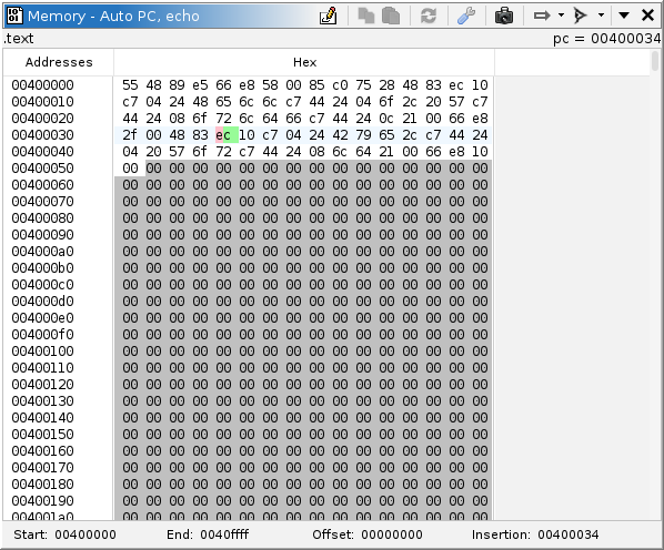 The dynamic bytes viewer supports editing memory. See Control and Machine State. Such edits are performed as usual: Toggling edits and typing into the editor, or by pasting byte strings. These edits may be directed toward a live target, the trace, or the emulator. NOTE: Please be wary of hand-typing large edits into the emulator, since every keystroke may produce a unique scratch snapshot. It is better to paste such edits instead.