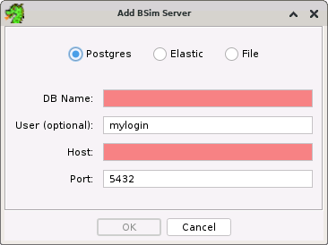Choose the type of BSim database first as that will affect the type of information that needs to be specified. For postgres and elastic, you must enter a database name, hostname/address, and port. Specify a host name of "localhost" for a server running on the local system. Invalid or missing entries are shown in red. For a file database, the "..." button is used to launch a filechooser for selecting an existing H2 database file (*.mv.db).