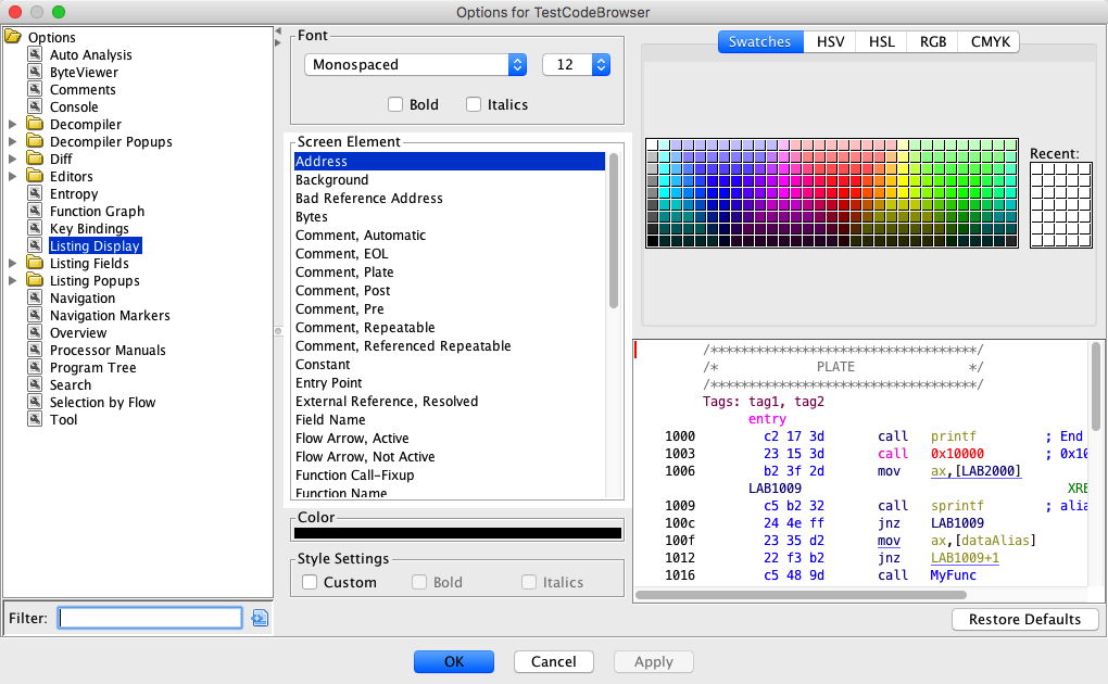 To view or change colors and fonts for fields of the Listing, open the Tool Options Dialog and select the Listing Display node in the Options tree. The Listing Display panel will be displayed as shown below.
