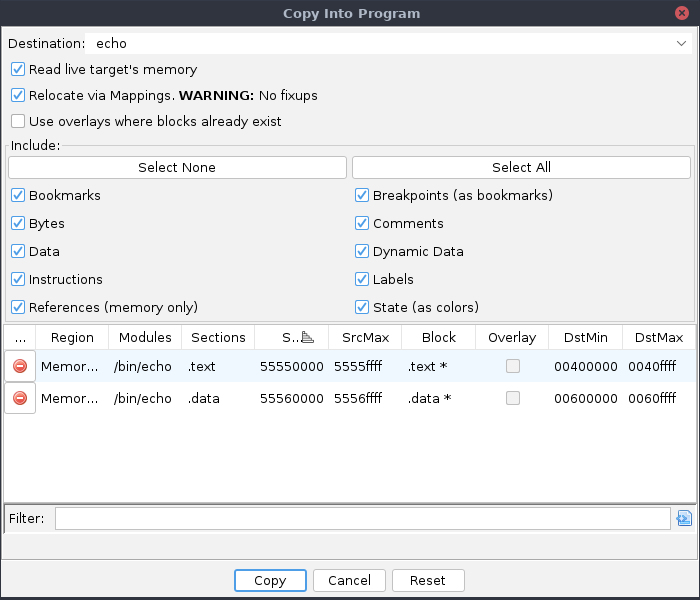 ranges to copy. For selected ranges not contained in the destination program's memory, new