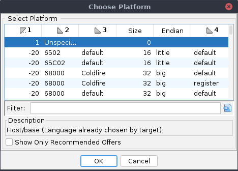 The "Show Only Recommended Offers" check can be disabled to display override platforms as well. Every language-compiler-spec pair is offered as an override platform. Selecting an offer and confirming the dialog will add or change to the selected platform in the trace. Furthermore, the choice will be added to the Choose Platform menu for the current trace.