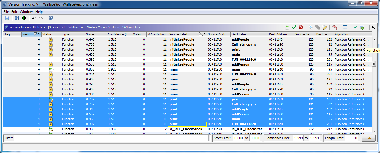 Duplicate Exact Symbol Name Match reports 1.0 for similarity score, since the symbols (minus the tacked on address) are identical. The confidence scores will all be less than 1.0. Duplicate Exact Symbol Name Match uses 10/(total source and destination matches) for raw confidence, but due to the log10 scaling of the confidence reporting column these values will always be less than 0.7*.