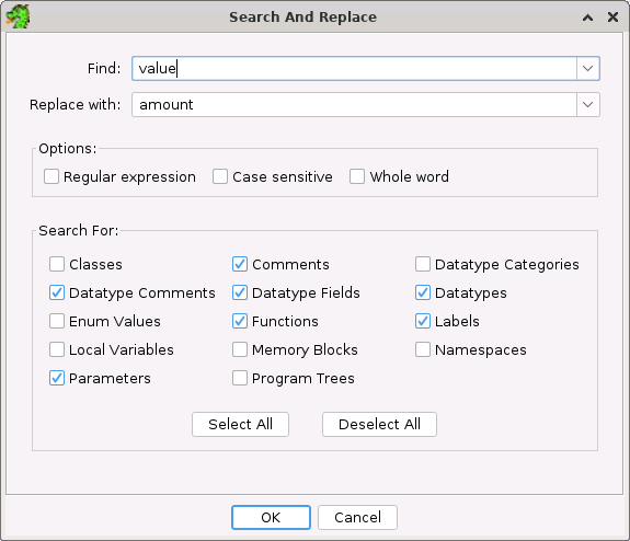 The search and replace feature allows to users to search for specific text sequences in various Ghidra elements and replace that text sequence with a different text sequence. Using this feature, many different elements in Ghidra can be renamed including labels, functions, namespaces, parameters, datatypes, field elements, enum values, and others. This feature can also be used to change comments placed on items such as instructions or data, structure field element, or enum values.