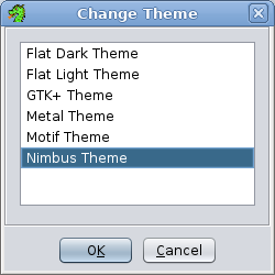 The Theme Chooser dialog displays a list of all the known themes, both built-in and custom. Select the desired theme and press the "OK" button to have the application switch to that theme. Pressing the "Cancel" button will exit the dialog without changing the theme. You can also double click on a theme to switch to that theme and exit the dialog.