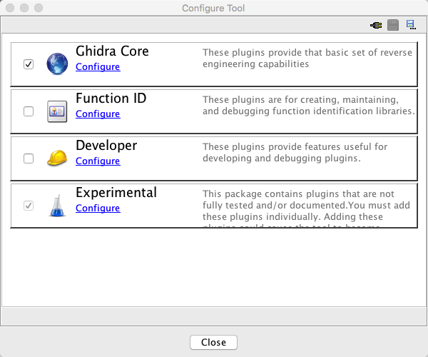 The Ghidra Project Window's Configure display shows its own list of eligible front-end plugins, as only certain plugins may be added to the Project Window.