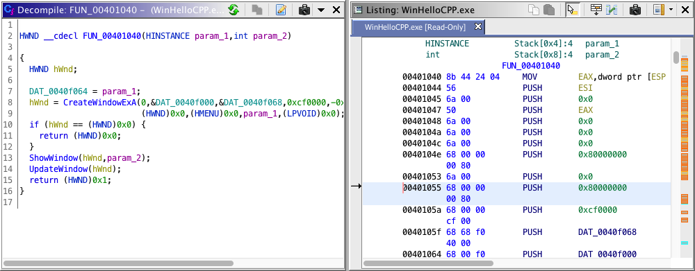 The Decompiler plugin is a sophisticated transformation engine which automatically converts the binary representation of individual functions into a high-level C representation. The Decompiler presents a view of a program which is interactive and dynamically updated as the user adds or makes changes to the annotations associated with the program. A Decompiler window maintains the correspondence between the C representation and the assembly representation displayed in the Code Browser window, to the extent possible. The window allows instant visual association and navigation between C language expressions and their corresponding assembly instructions.