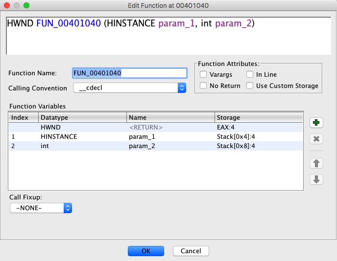 The Edit Function Signature dialog allows you to change the function's signature, the calling convention, whether the function is inline and whether the function has no return.