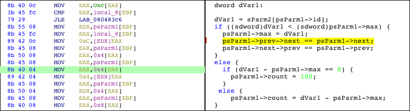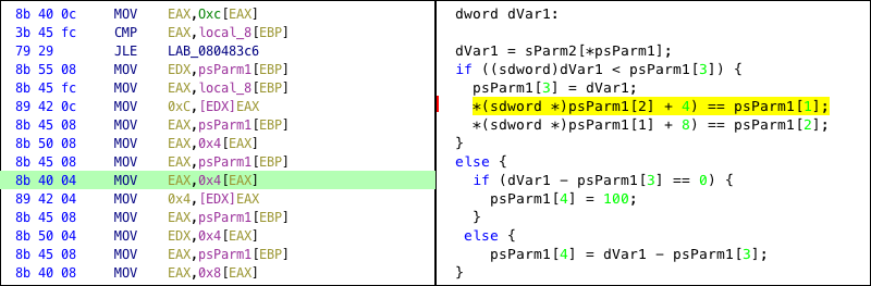 It is important to note that the decompiler is only as good as the definition of the the underlying assembly language code. Each assembly instruction has an associated PCODE definition that describes what the instruction does, essentially an RTL (Register Transfer Language). For example, the following MOV instruction which moves a value into an offset onto the stack also has a PCODE definition.
