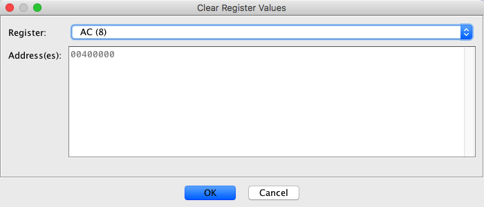 To clear a register value over an address range, first create a selection in the browser and then invoke the Clear Register Values action by using the right-mouse popup. The following dialog appears.