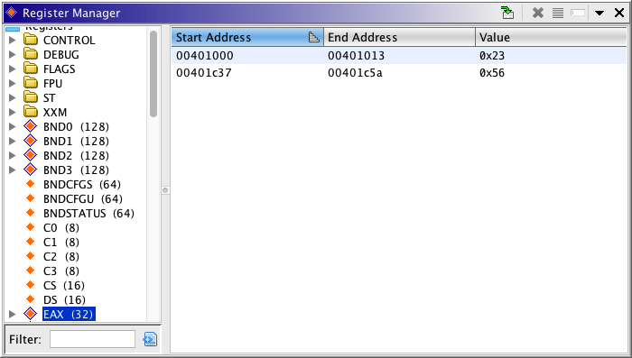 The right side of the Register Manager is a table that displays ranges of addresses that have assigned values for whichever register is selected in the register tree. Initially, the table only contains values that have been explicitly associated with the selected register and addresses. There is an option in the drop down menu that will cause the table to also show default values for a register. Default values are assigned by the language and usually only apply to context registers.