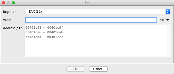 To set a value for a register across an address range, first create a selection in the browser and then invoke the Set Register Values action by either using the right-mouse popup or using the <Ctrl>R quick key. The following dialog appears.