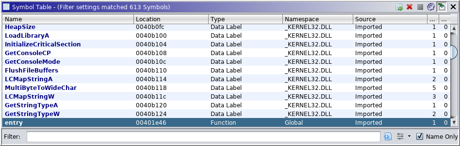 Label Name of symbol. Location Address where the symbol is defined. Type Symbol type (Function, External, Class, etc). Namespace Namespace of the symbol; i.e., the scope. Source Indicates where the symbol name came from. Reference Count Total number of references made to this symbol.