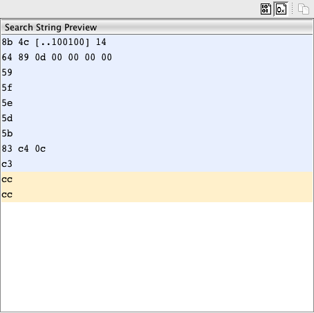 The Preview Table shows what the search string will look like, in either binary or hex format. It will change dynamically as masks are applied/removed in the Instruction Table.