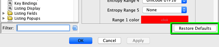 You can restore any currently selected options panel to its default settings by pressing the Restore Defaults button at the bottom of the options panel. Use caution when executing this action, as it cannot be undone.