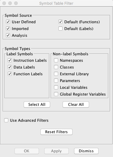Symbol Type Filters - This group of filters determines which types of symbols to include in the query. All symbols in Ghidra are one of the following types. At least one of these type filters must be selected.