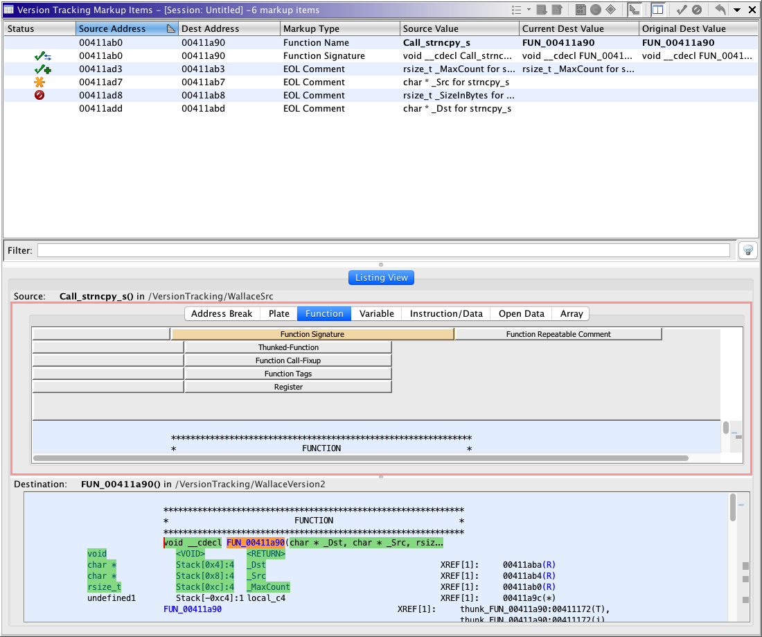 The dual listing appears below the Markup Items table when the Listing View tab is selected. It shows one listing for the source program and another listing for the destination program. When a function match is selected, each listing displays only the addresses that are part of the function. When a data match is selected, the source listing will display the addresses that make up that data and the destination listing will display the addresses that would be affected if it were applied.